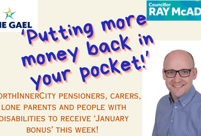 The January Cost of Living Double Payment will be paid this week to support North Inner City Pensioners, Carers, Lone Parents and People with Disabilities across Dublin with the cost … Continue Reading North Inner City pensioners, carers, lone parents, people with disabilities to receive January Double payment this week – McAdam
