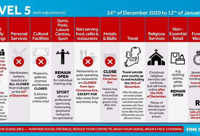 Ireland is moving to Level 5 of Covid-19 restrictions with adjustments between 24 December and 12 January. I have posted a list of these restrictions below under different areas and … Continue Reading Update on new Covid-19 Measures